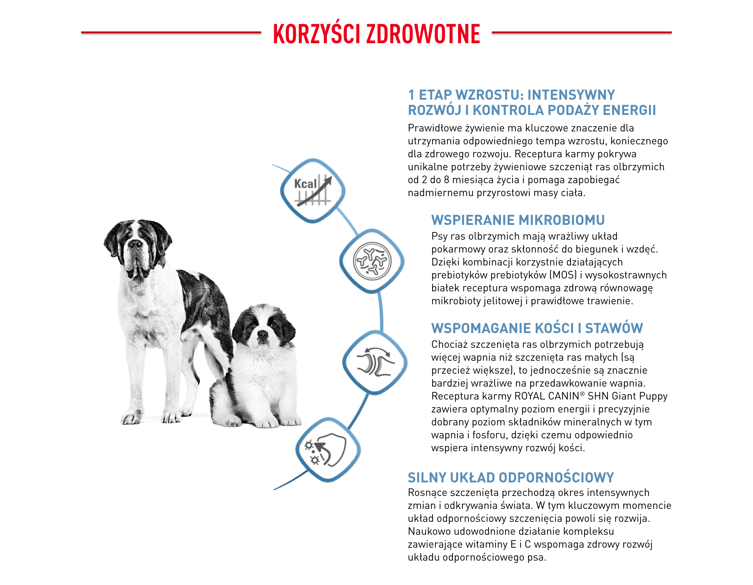 - Kontrolowany poziom energii przy intensywnym wzroście. Receptura karmy wspomaga okres intensywnego wzrostu szczeniąt ras olbrzymich
