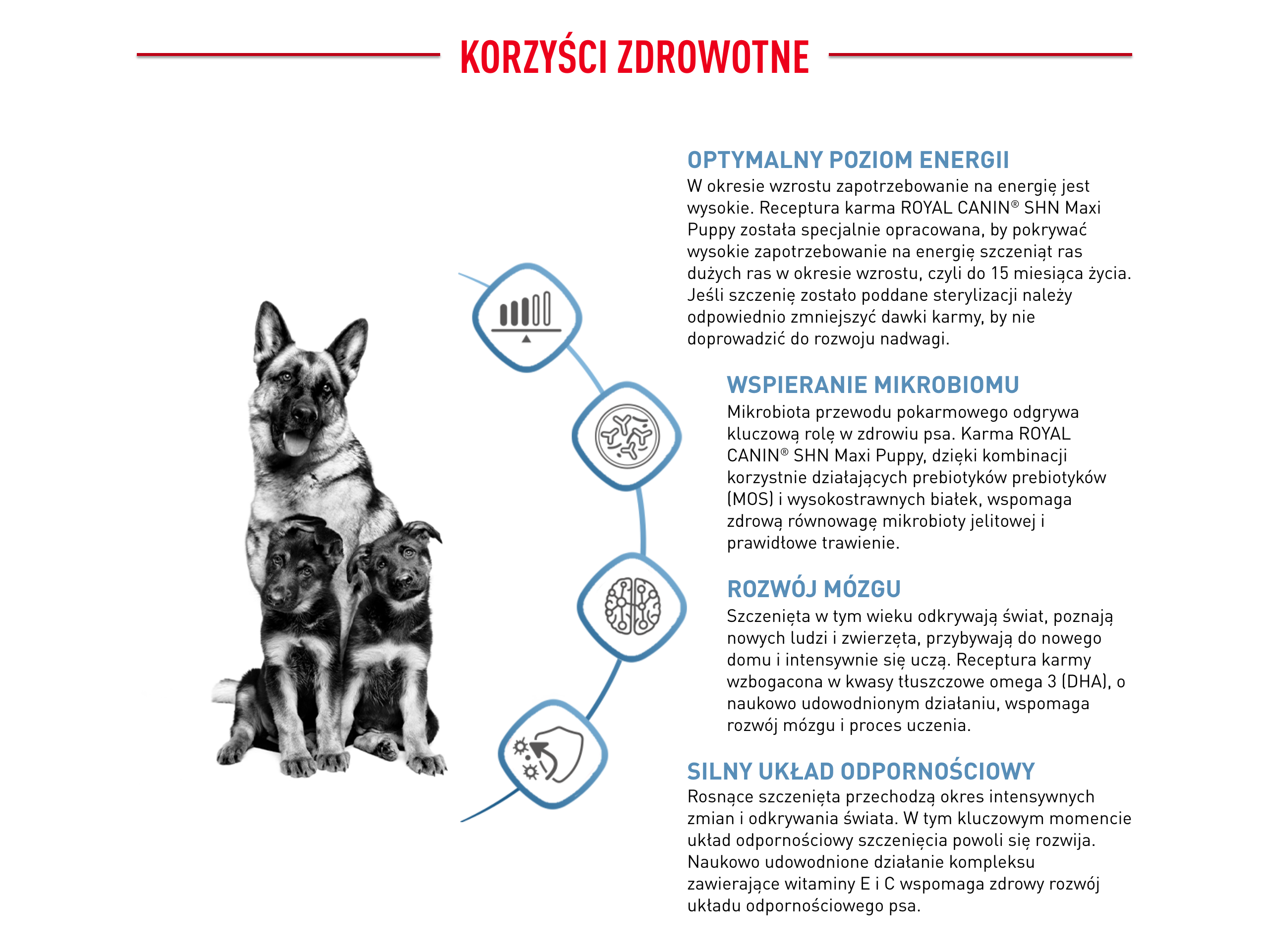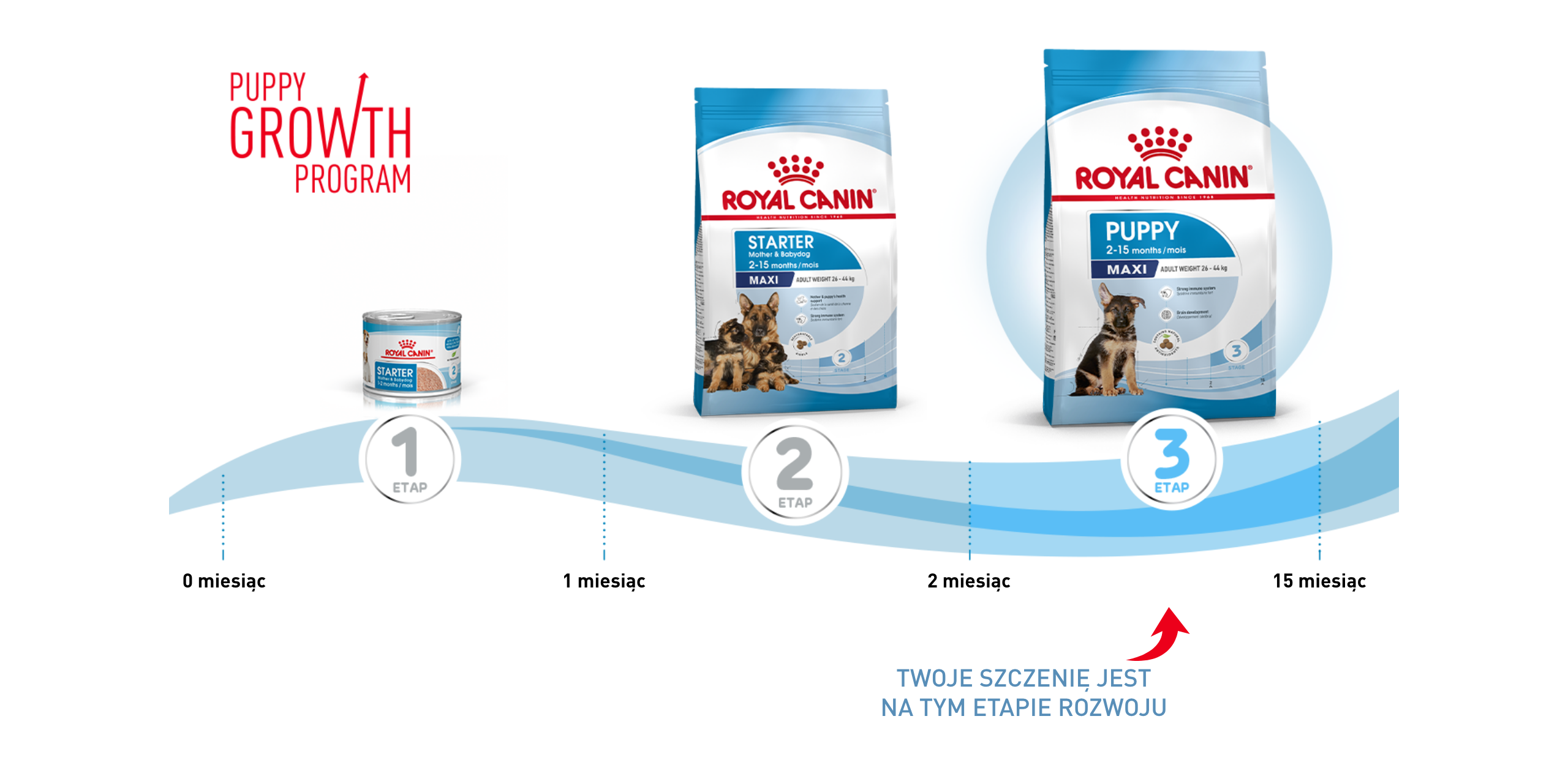 Karma sucha ROYAL CANIN® Maxi Puppy została specjalnie opracowana, aby pokrywać w pełni potrzeby pokarmowe szczeniąt ras dużych. Karma jest przeznaczona dla szczeniąt ras dużych w wieku od 2 do 15 miesięcy, które po zakończeniu wzrostu osiągną masę ciała 26-44 kg.