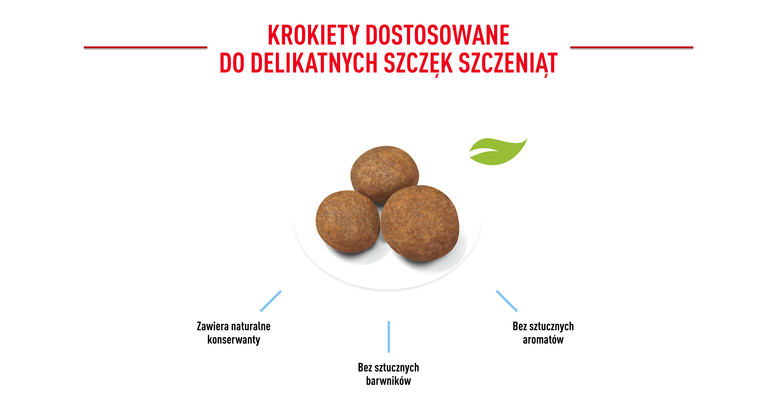 Krokiety ROYAL CANIN® Maxi Puppy zostały specjalnie dostosowane do rozmiaru szczęk szczeniąt ras dużych. Kształt i wielkość krokietów odpowiednio regulują tempo jedzenia i sprzyjaj uczuciu sytości. Mechaniczny efekt czyszczenia zębów podczas rozgryzania krokietów wspomaga higienę jamy ustnej.