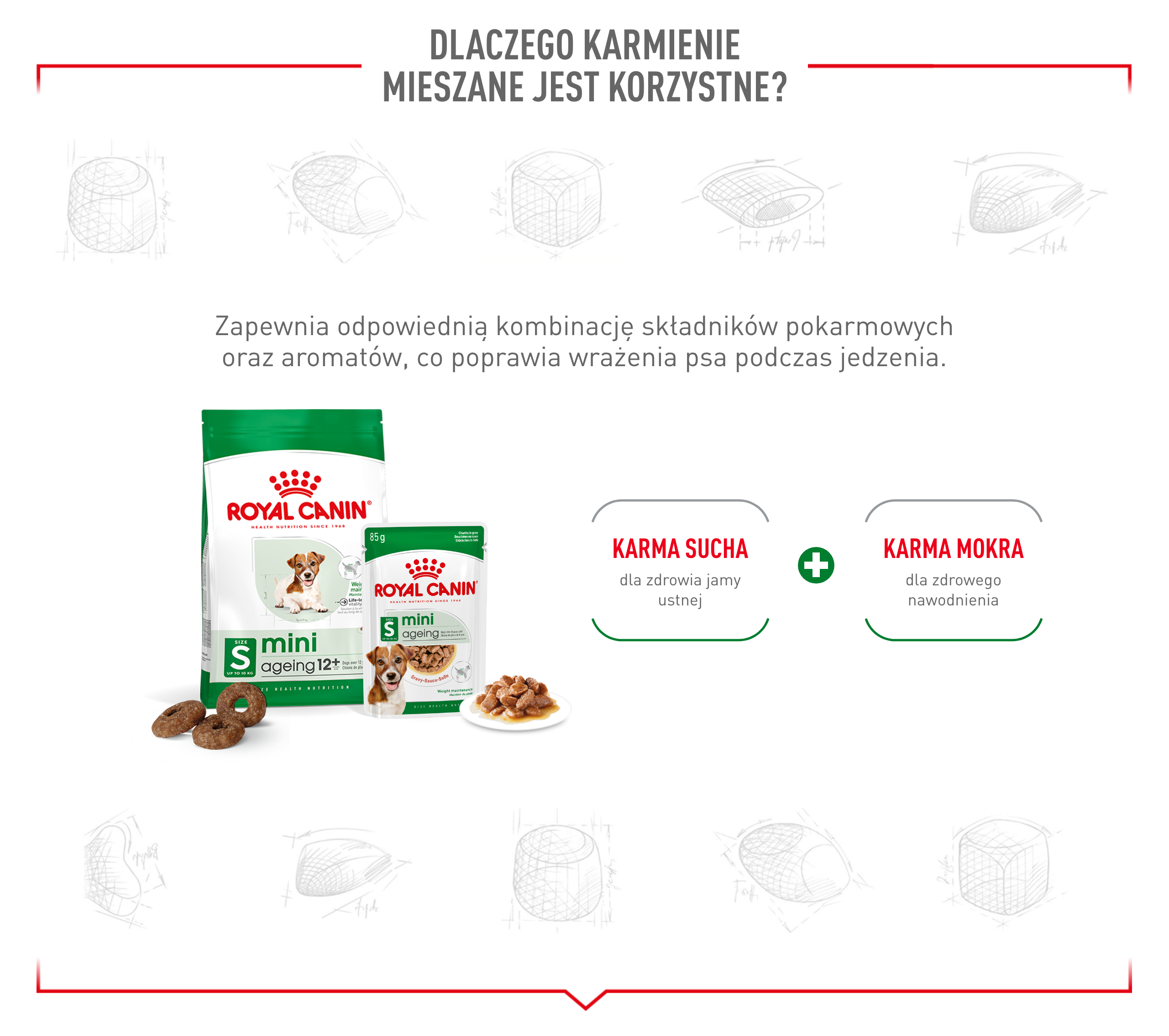 Karmę suchą ROYAL CANIN® Mini Adult 12+ można stosować z odpowiednimi karmami mokrymi Royal Canin, w formie pasztetu lub kawałków w sosie (karmienie mieszane). W przypadku starszych psów mieszanie suchej karmy z mokrą karmą o silniejszym zapachu może pomóc zwiększyć smakowitość posiłku, ponieważ starzenie się może powodować pogorszenie zmysłu węchu.