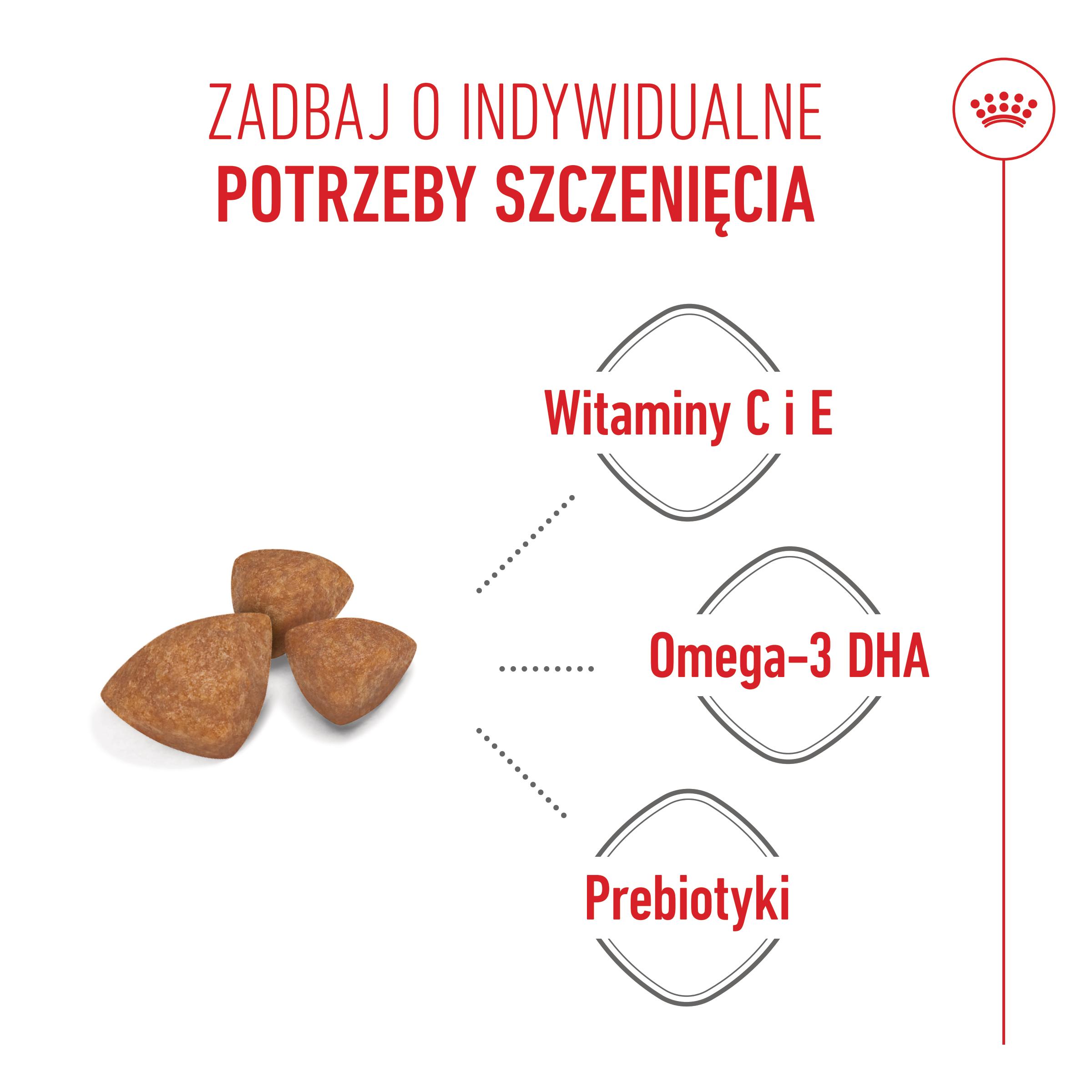 Karma ROYAL CANIN® X-Small Puppy została oparcowana specjalnie z uwzględnieniem specyficznych potrzeb Twojego szczenięcia rasy bardzo małej. Karma dostarcza optymalnej ilości włókna pokarmowego ułatwiajacego pasaż jelitowy i sprzyjającego dobrej konsystencji kału.