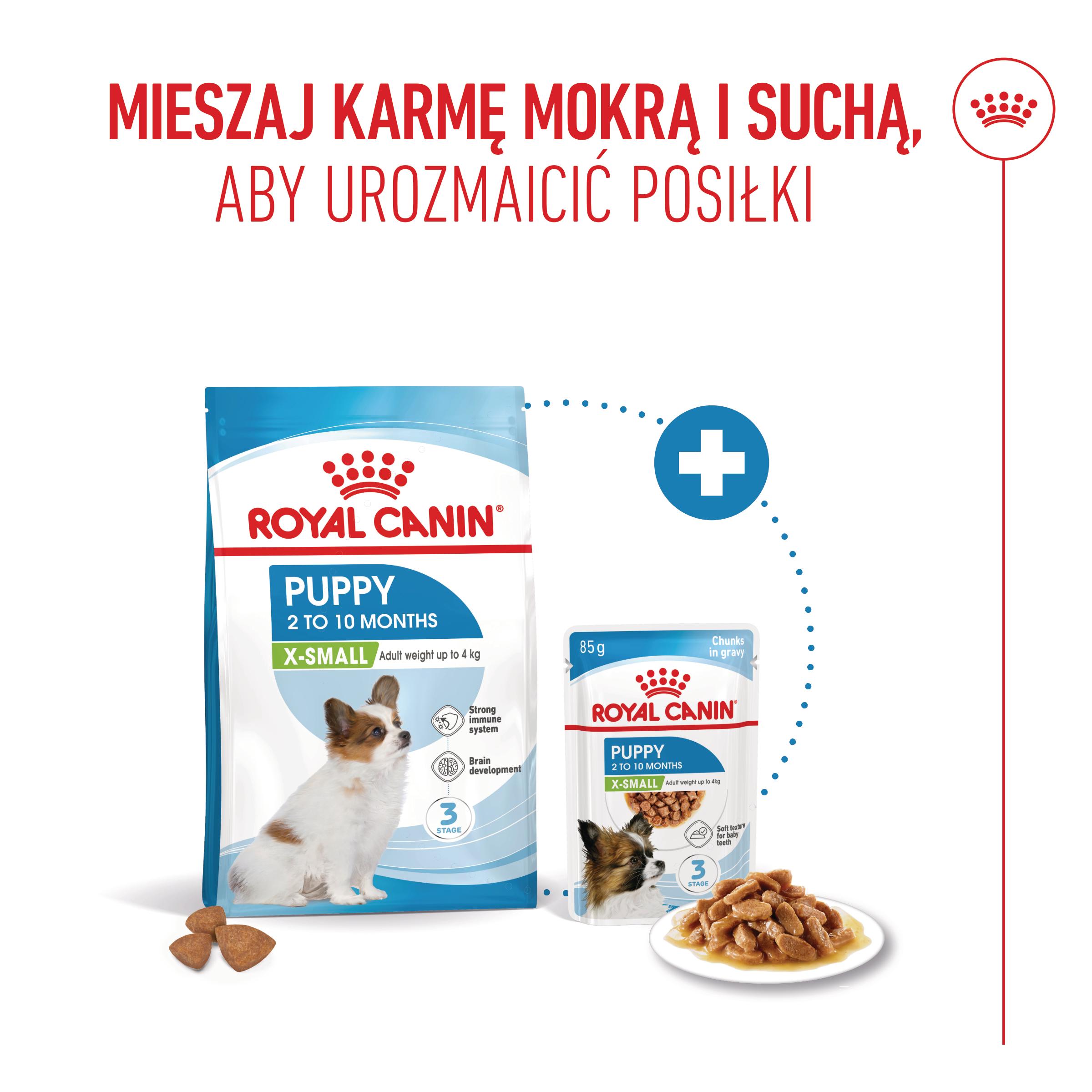 Karma ROYAL CANIN® X-Small Puppy opracowana specjalnie dla psów do 10 miesiąca życia, pokrywa wszystkie potrzeby pokarmowe szczeniąt ras bardzo małych, osiągających w dorosłości masę ciała nie większą niż 4 kg.
