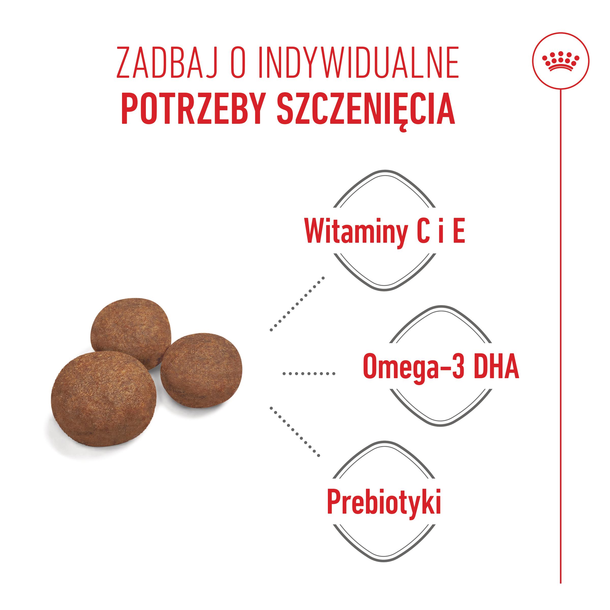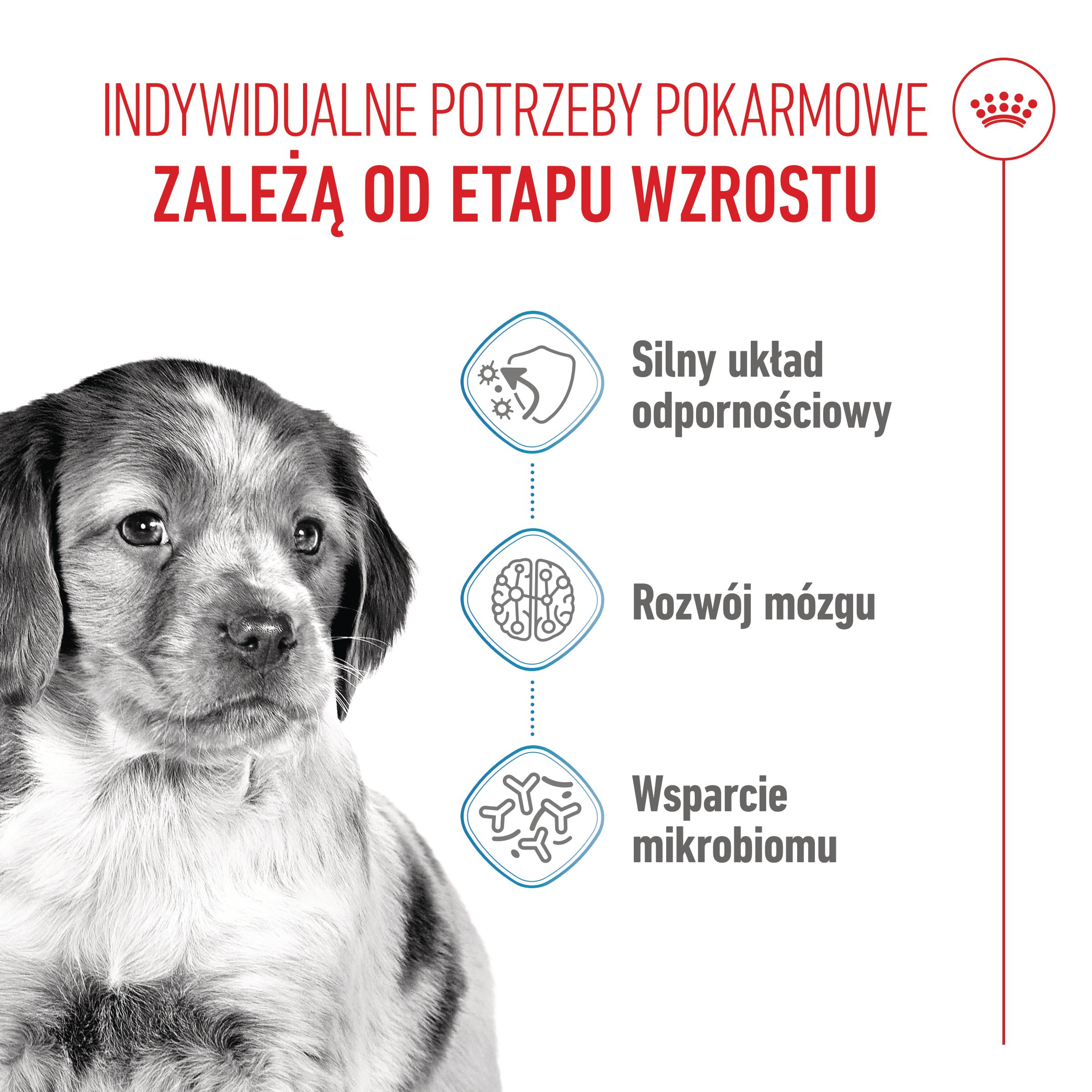 - Optymalny poziom energii. Pokrycie wysokich potrzeb energetycznych szczeniąt ras średnich