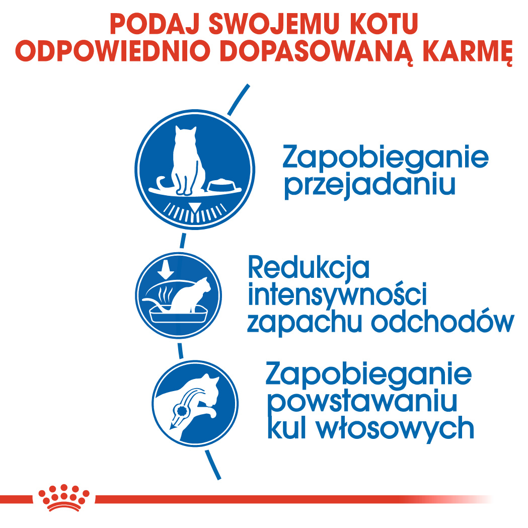 Dzięki unikalnej kombinacji włókna, w tym psyllium, karma ROYAL CANIN® Indoor Appetite Control pobudza pasaż jelitowy oraz ułatwia eliminację połkniętej sierści.