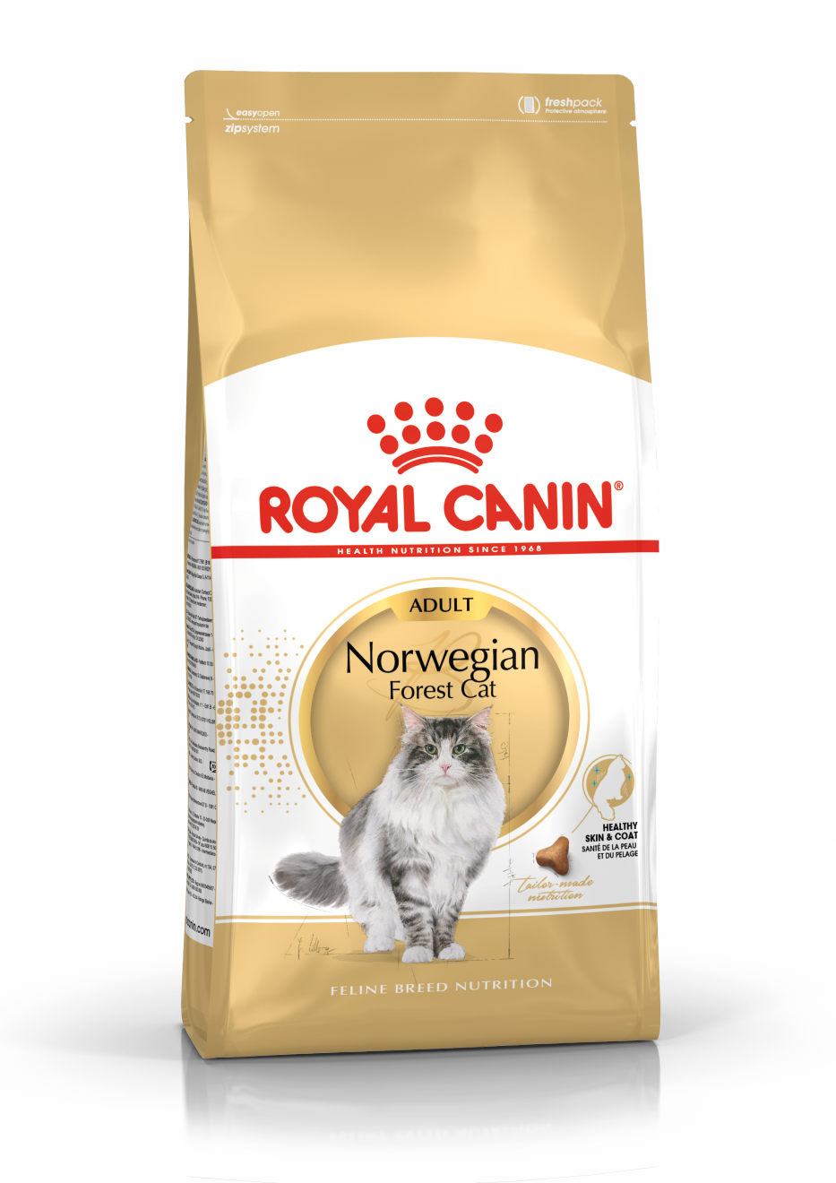 ROYAL CANIN® Norwegian Forest Cat Adult to karma opracowana specjalnie dla norweskich kotów leśnych powyżej 12 miesiąca życia. Unikalny krokiet, dostosowany do budowy szczęk norweskich kotów leśnych, zachęca do dłuższego rozgryzania, spowalniając tempo jedzenia.