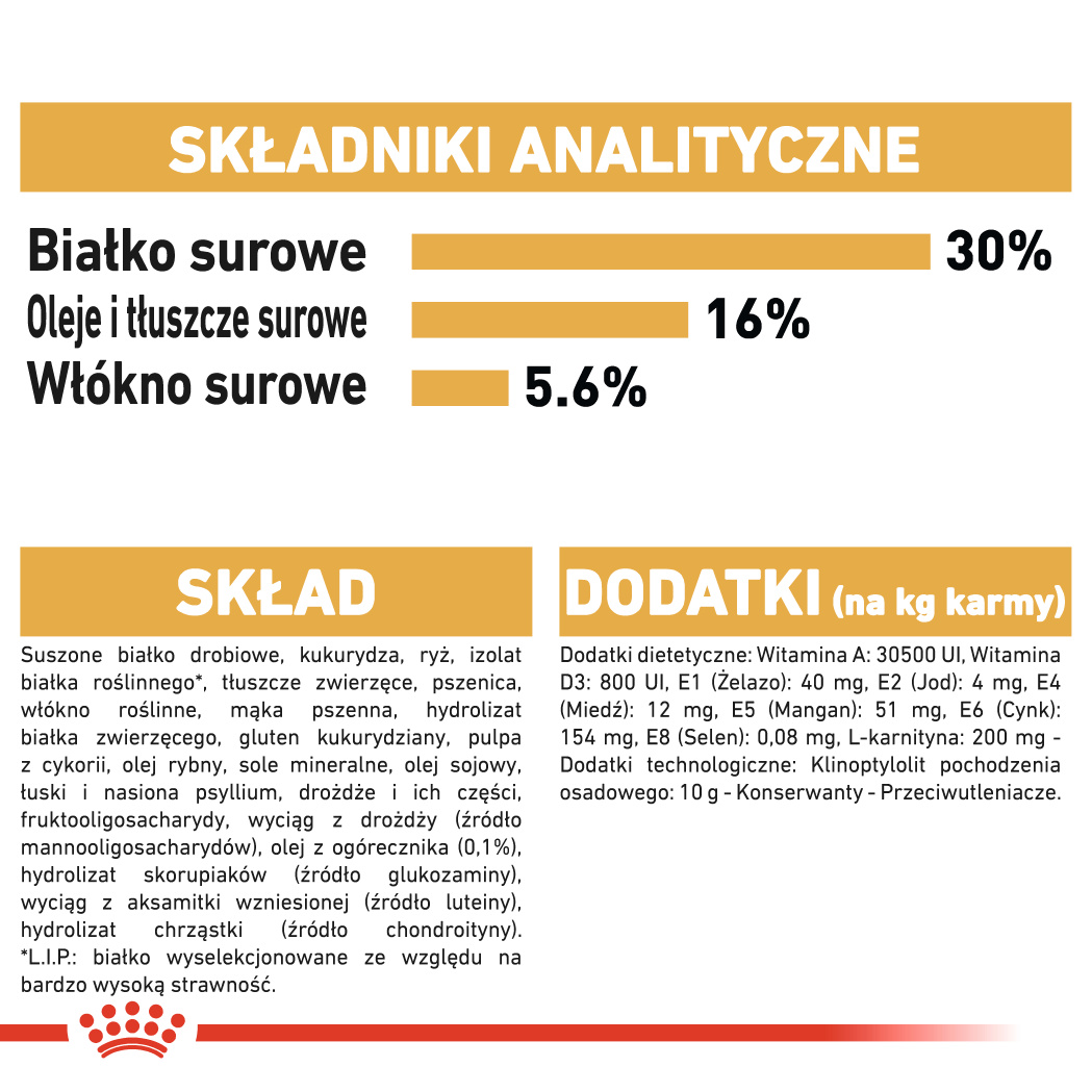 suszone białka drobiowe, kukurydza, ryż, gluten pszenny*, tłuszcze zwierzęce, pszenica, hydrolizowane białka zwierzęce, włókno roślinne, mąka pszenna, gluten kukurydziany, pulpa z cykorii, minerały, olej sojowy, olej z ryb, łuski i nasiona psyllium, produkty drożdży, fruktooligosacharydy, drożdże (źródło mannooligosacharydów), olej z ogórecznika (0,1%), glukozamina uzyskana z fermentacji, mączka z aksamitki, hydrolizowana chrząstka (źródło chondroityny). *L.I.P.: białko wyselekcjonowane ze względu na bardzo wysoką strawność.