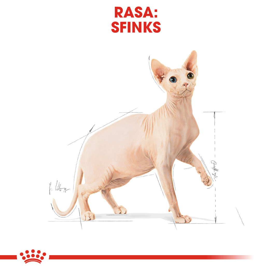 Z powodu braku owłosienia koty rasy sfinks potrzebują karmy wysokoenergetycznej, aby zrównoważyła utratę ciepła przez skórę. Karma ROYAL CANIN® Sphynx Adult charakteryzuje się wysoką kalorycznością, dzięki podwyższonemu poziomowi tłuszczu, co pozwala pokryć wysokie potrzeby energetyczne kotów tej rasy. Odpowiedni bilans składników mineralnych w karmie wspomaga ochronę układu moczowego.